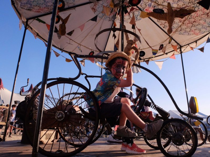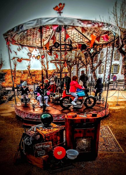 Le Gimmik Manège est une attraction artistique interactive qui revisite l’univers du manège traditionnel à travers une création artisanale. Pensé comme une expérience immersive, il mêle musique et décor rétro à 99,9 % recyclé. Il transporte les passagers pour un voyage spatio-temp-musical…